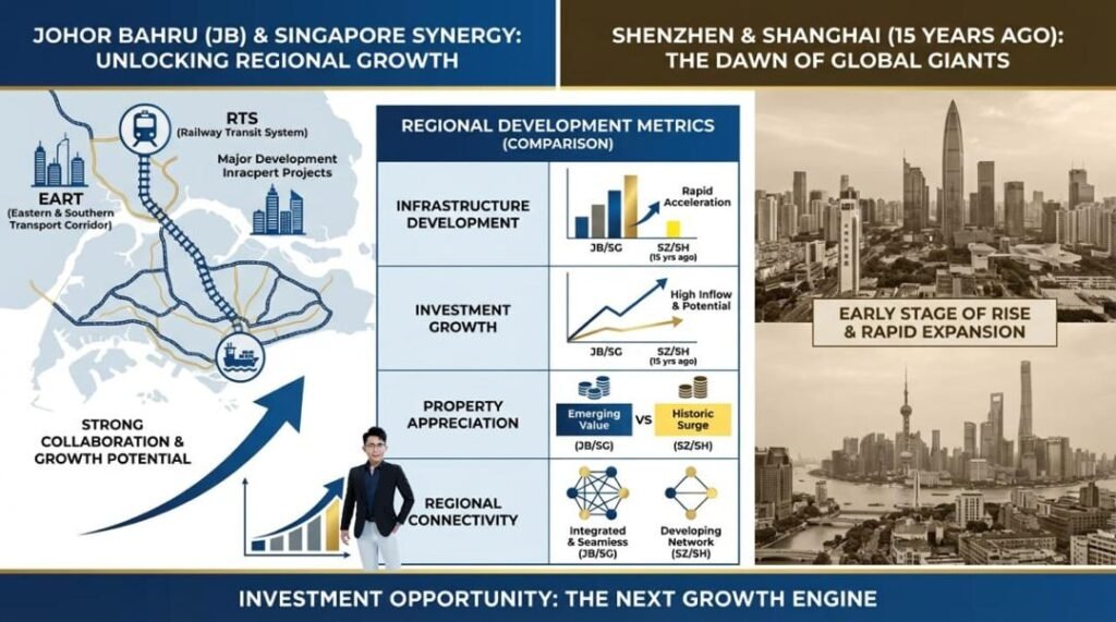 从区域发展的角度来看, 如今的柔佛与新加坡之间的协同效应,正如15年前上海与深圳崛起前的阶段。